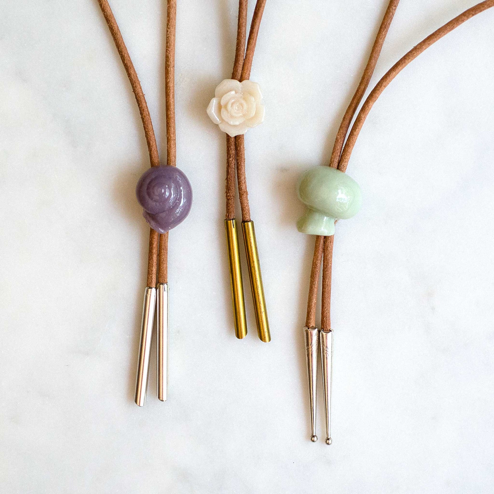 Glass treasures cast from handcrafted molds of the actual item, including mushrooms, shells, and fossils: Each treasure sits on a natural undyed leather cord with sterling silver classic or modern tips, or modern brass tips (L to R in last image).